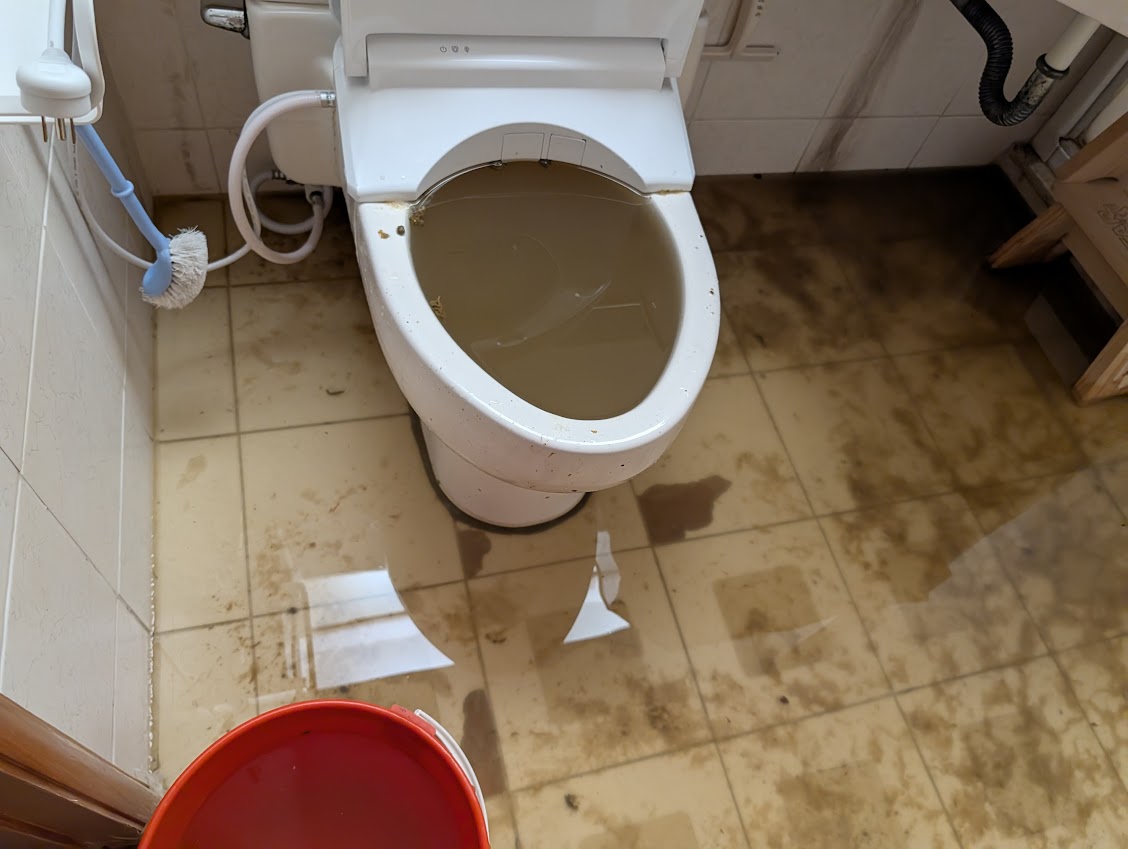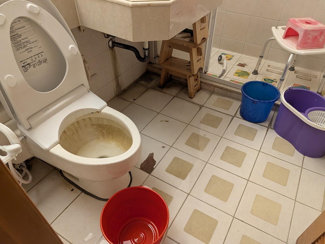 某社區大樓2樓受災戶馬桶不斷冒水 找通管師傅來疏通 不久又開始冒水 造成生活上的困擾 每次馬桶冒水都會淹進客廳 日子過得心驚膽跳